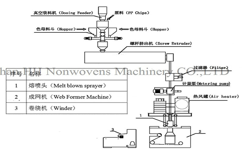Main extruder→filter→Metering pump→Air heating system→Melt blown sprayer (ENKA sprayer)→Web former→Winder→Slitter