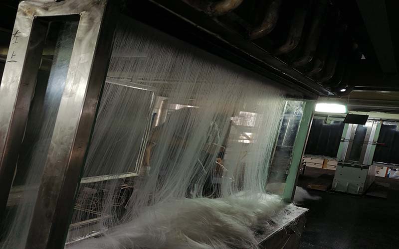Raw material →Melting→Filtering→Measureing→Air heating→Spraying→Web forming→Winding→Cutting→Final product