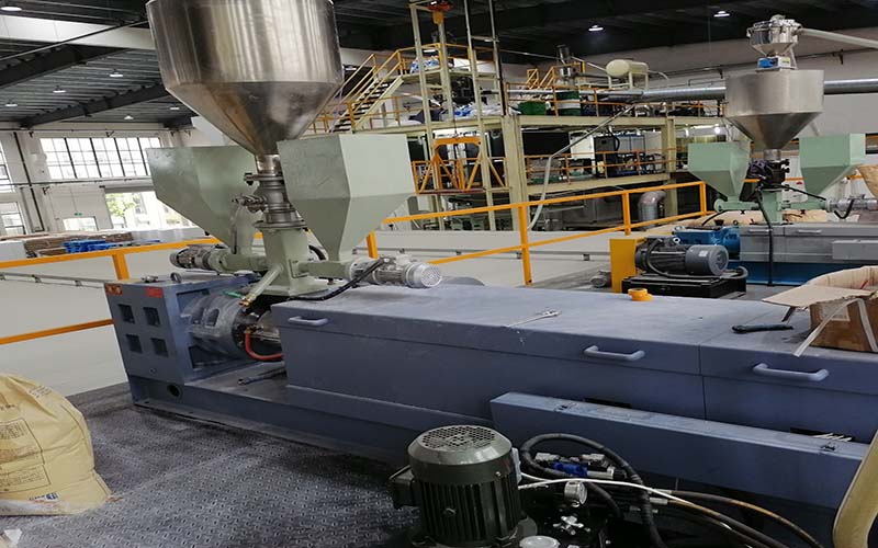Recycle extrude→Main extruder→Filter→Metering pump→Monomer suction device→spinning box( Changzhou/ENKA/KASEN spinneret )→Quenching air chamber→stretching device→Web former→Calender→Winder→Slitter